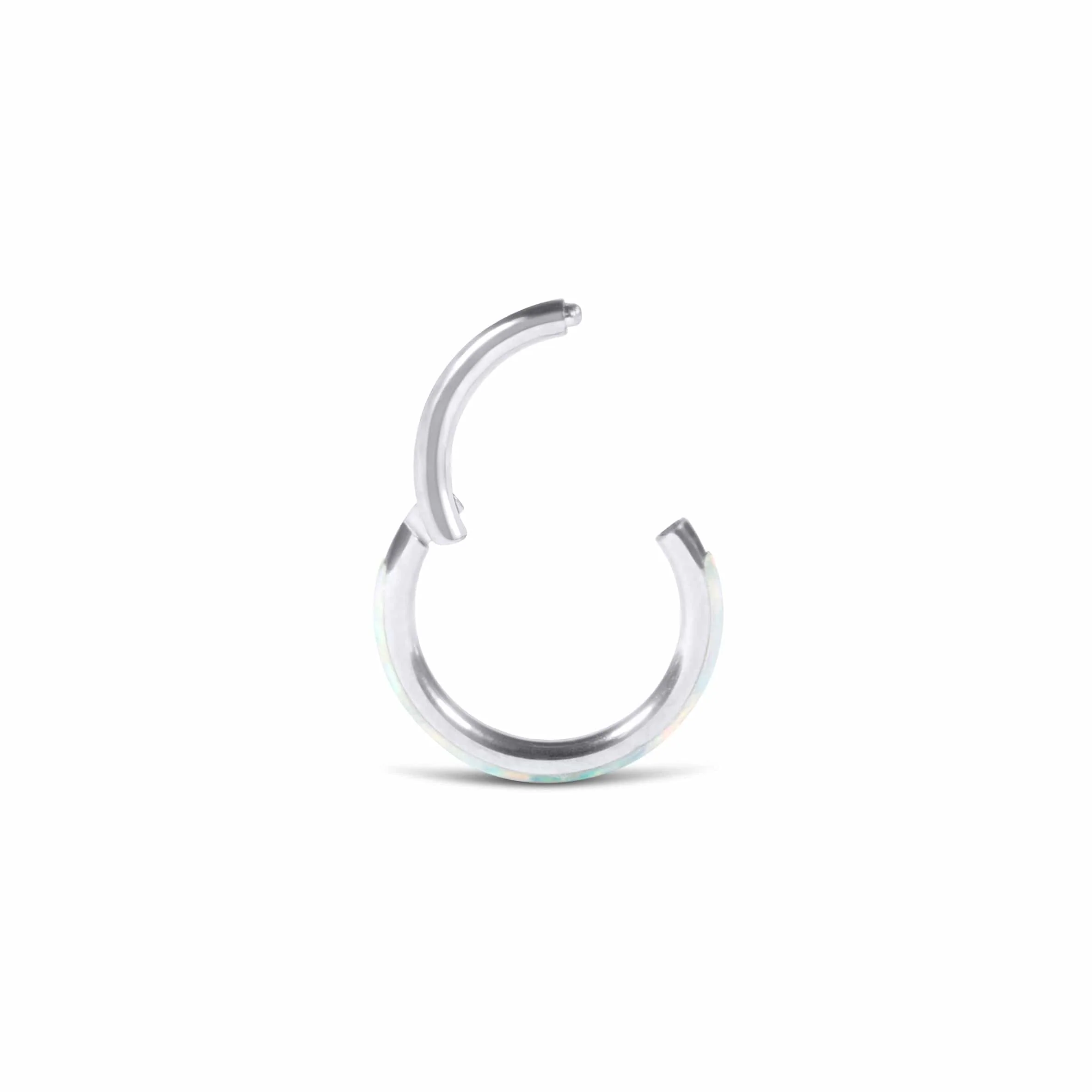 Curate your perfect ear with the addition of the orion clicker hoop, a classic circular hoop with rainbow opal inlay perfect for the rook, forward helix, helix or conch.