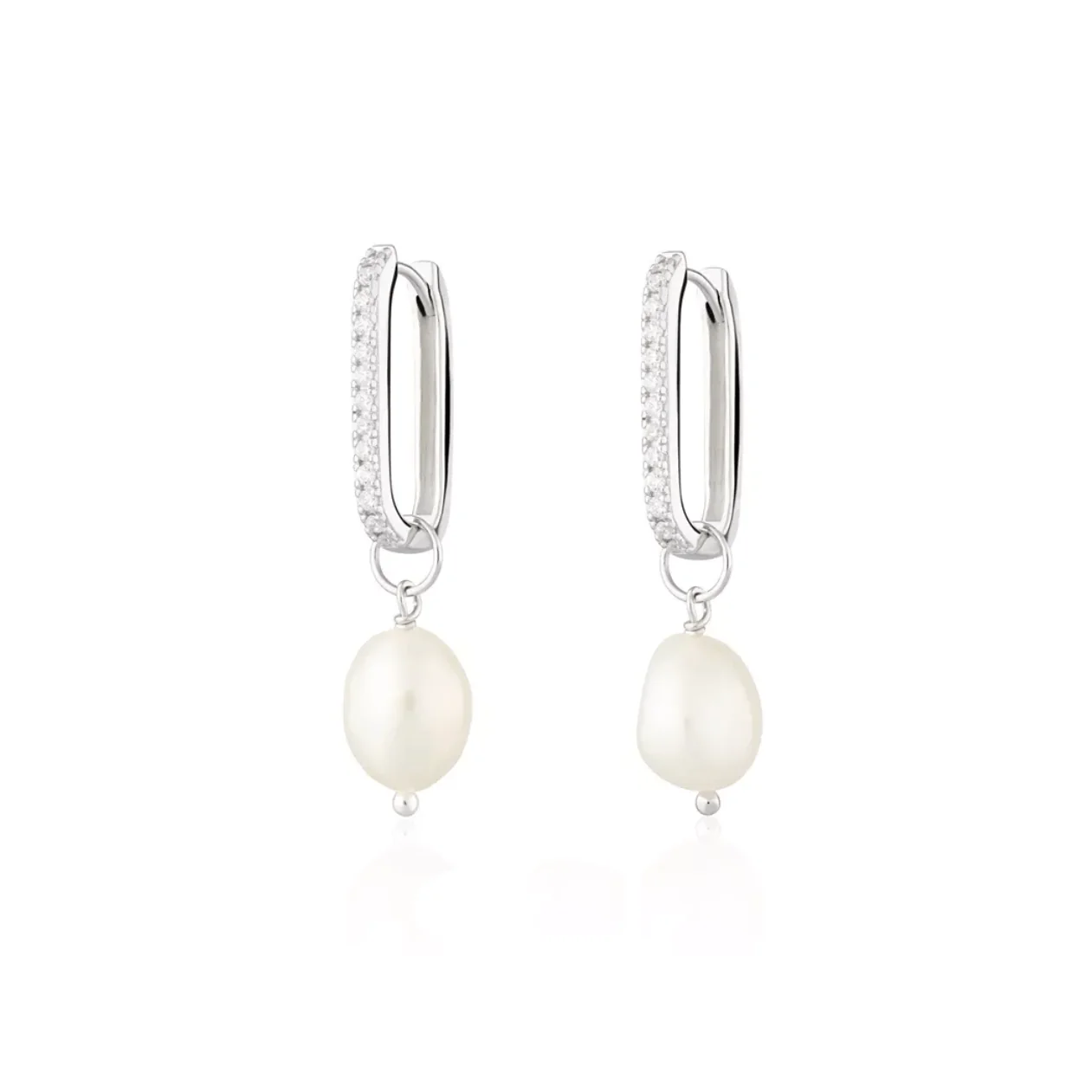 Curate your perfect ear with the addition of the Fresh Water Pearl Charm Hoop Earrings, a beautiful elongated pave crystal hoop with single fresh water pearl removable charm.