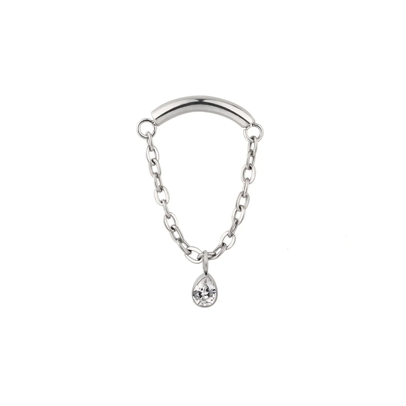Curate your perfect ear with the addition of the Teardrop Hidden Helix Labret Earring, Internally Threaded Helix Earring with single teardrop crystal on a chain, a statement piece for the helix position.