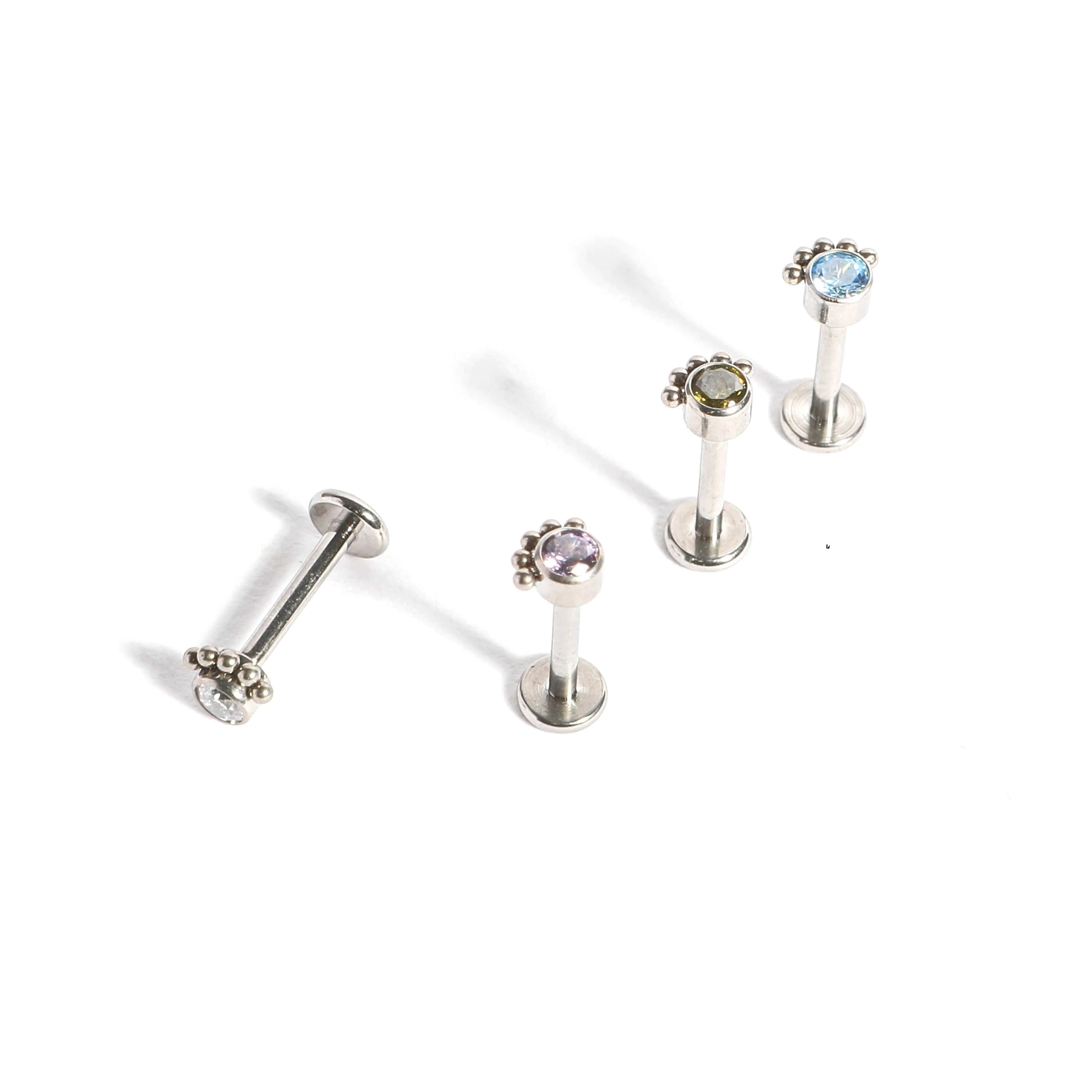 Curate your perfect ear with the addition of the Titanium Halo Dot Labret Stud with option of 4 colours of crystal, perfect for the tragus, helix, forward helix or medusa piercing.